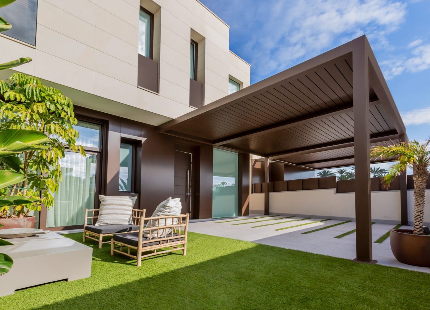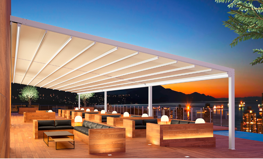 Le confort à ciel ouvert La pergola en toile tendue est un système de protection solaire modulaire qui permet de créer des environnements extérieurs confortables, en ajoutant de l'élégance à tout type d'espace.Son design dynamique et modulable aux lignes droites permet à la pergola de s'intégrer parfaitement dans tout type de jardin ou de terrasse, en protégeant de grandes surfaces.