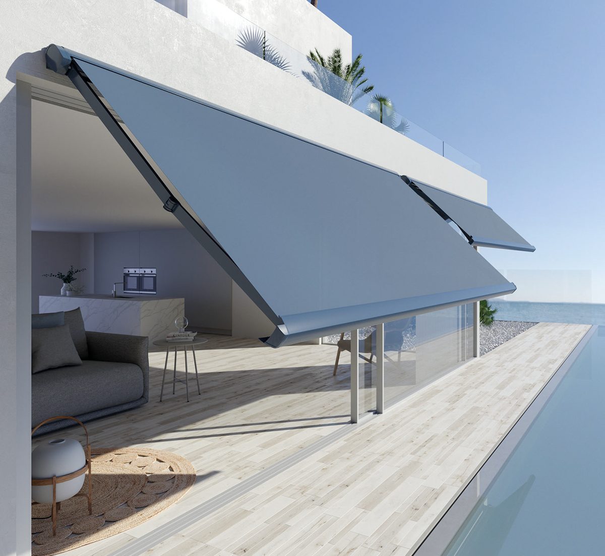 Wind Screen VOLALUX est un système de protection solaire innovant, spécialement conçu pour une installation en extérieur, devenant ainsi la solution parfaite pour réguler l'entrée de la lumière et l'intimité des pièces. Son entraînement motorisé Somfy facilite la manipulation, permettant un déplacement vertical de la toile et la création de différentes ambiances, en fonction de l'éclairage et des conditions thermiques du moment dans chaque espace.